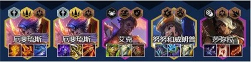 3:努努和莎弥拉有什么给什么即可,最优努努鬼书,板甲,离子火花,莎弥拉最优是攻速旗,羊刀,轻语;
