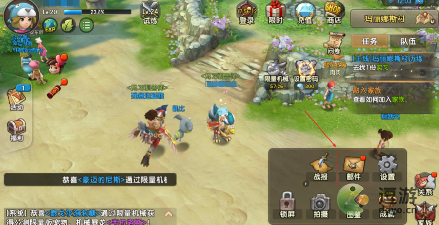4、回到游戏主界面,再次点击右下角的“三条杠”,在弹出的菜单中,点击“邮件”,进入“邮件”列表领取就可以了。